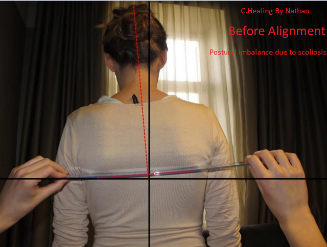 This client received a spinal alignment session. Before the session, there is a notable visible curve in the spinal bones position themselves, resulting in off center posture and head tilting to one side, uneven shoulders, as well as a visible misalignment in the scapular bones, which is measured with a ruler as a tool for indicating straightness.