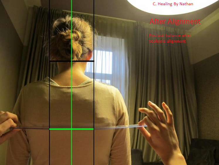 Due to temporary muscle memory -postural adaptation due to scoliosis,immediately after the session some clients still may have a habit of lifting one shoulder a bit higher than the other, or lifting one leg slightly up. This is normal and is a result of muscle adaptation due to scoliosis and pelvic twist- called muscle compensation, or postural compensation, which is a well known process in orthopedic medical field as well as in physiotherapy, kinesiology and chiropractics ,making this a generally accepted concensus.