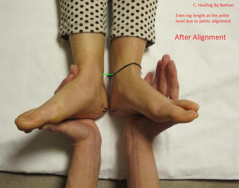 After the session, those ankle bones align perfectly on both legs, showcasing equalization of leg length as a result of pelvic alignment.